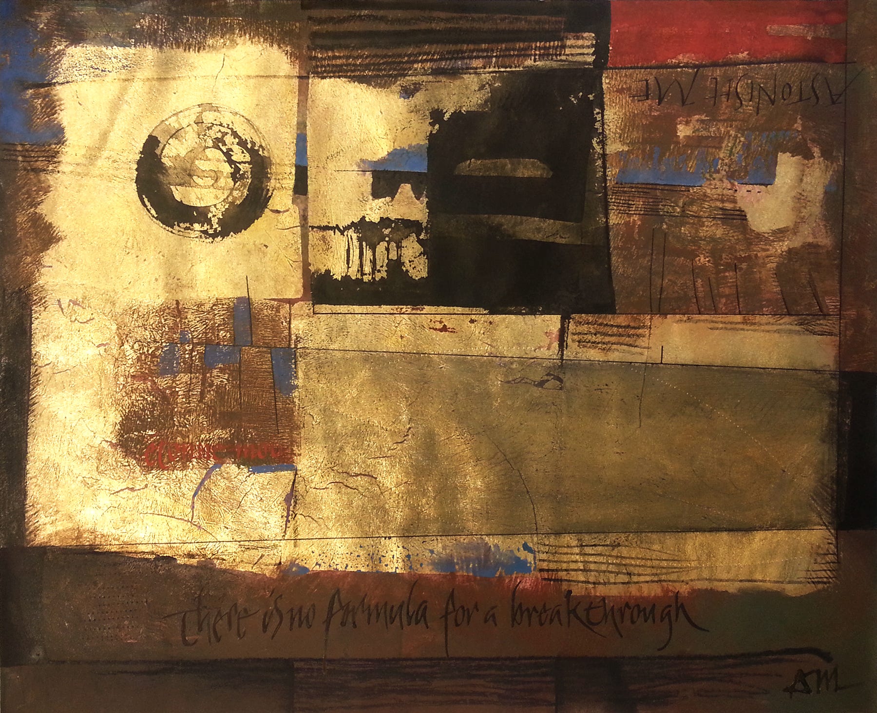 After some years of accumulating bits and pieces, those bits find their way onto the same page. Ruled guidelines become striations, a bit of Mondrian or Calder seeps in with the red-yellow-blue, some gold powder and gold leaf fall into place with varying brightness, some acrylic gouache forms areas that both protect and resist, scoring tools make their marks, and brushes and pens contribute their marks too. Edges are lost and found, and contrasts of dark/light, matte/gloss, and warm/cool help the framing and spatial depth.