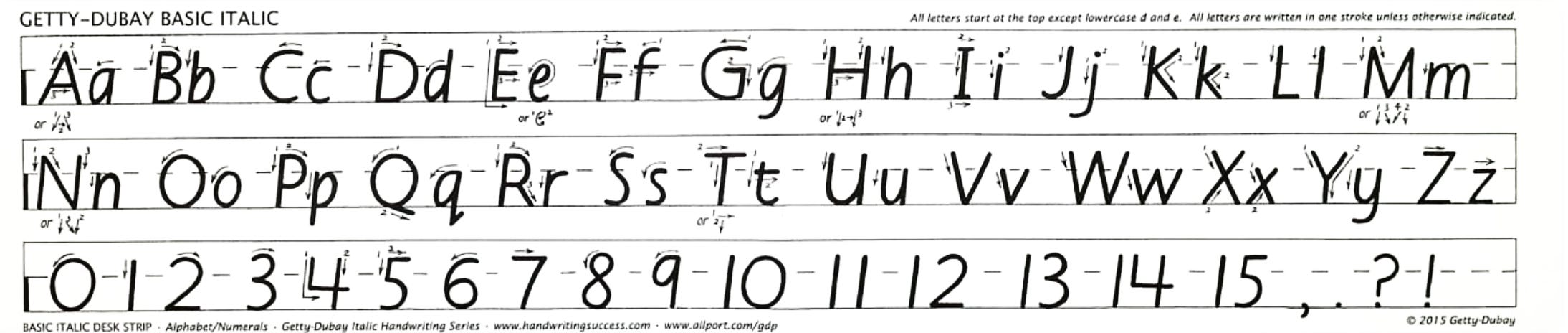 Already we have our toe in the water. Everyone picks up the pencil. Some students are lucky enough to have had an early introduction to making letters following the commonsense structure of the Italic-based model rather than the historic Palmer cursive. An increasing number of grade school teachers have gathered the knowledge, skill, and enthusiasm to teach the Getty-Dubay method to their students. This simpler method reaches younger students and makes a huge difference in building awareness of creating form. It is also preferred for the disabled or dyslexic.