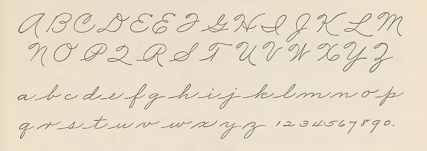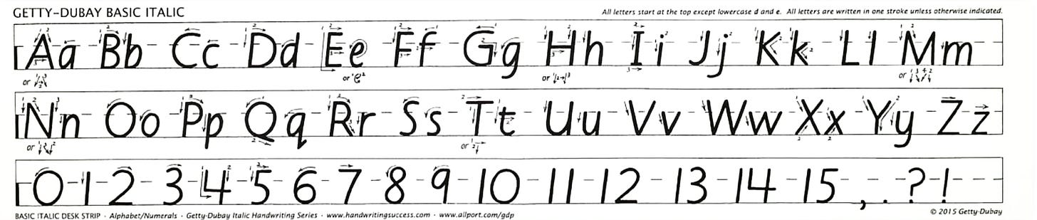 Compare the Getty-Dubay model above to the 130 year old Palmer method, a system of movement that is based not on geometry, but on flowing motion popular in the late 19th c. Growing up in the 20th century schoolchildren in the United States were taught to follow this model.