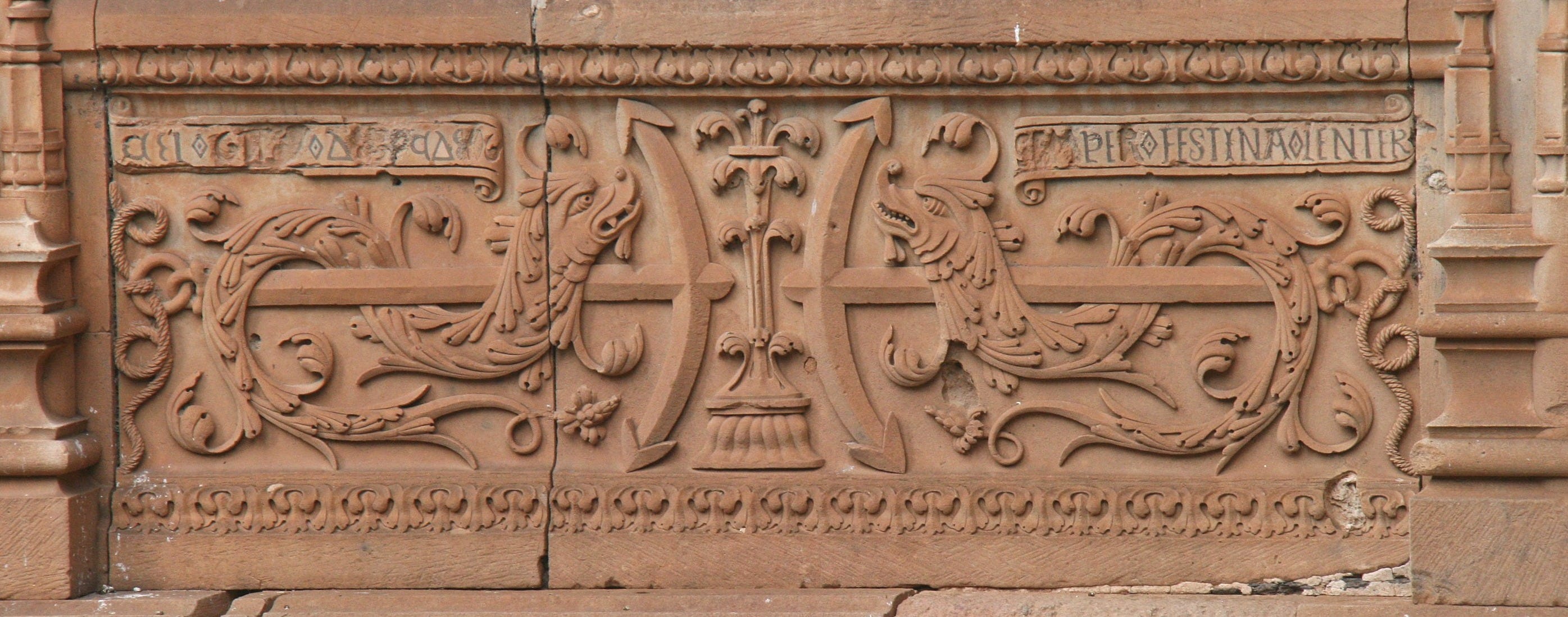 At the University of Salamanca, founded in 1218, the motto in both Greek and Latin with the dolphin/anchor image are among the seven university emblems carved into the building facade. Σπεῦδε βραδέως or festina lente is phonetically spelled speûde bradéōs.