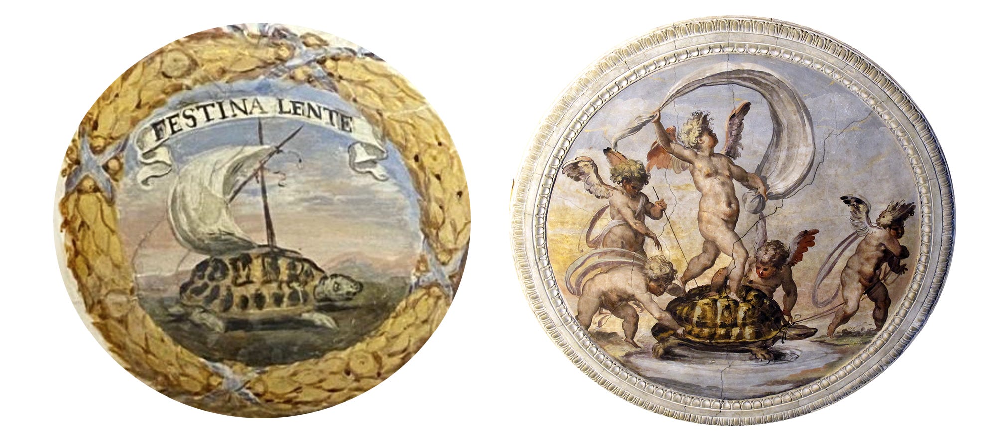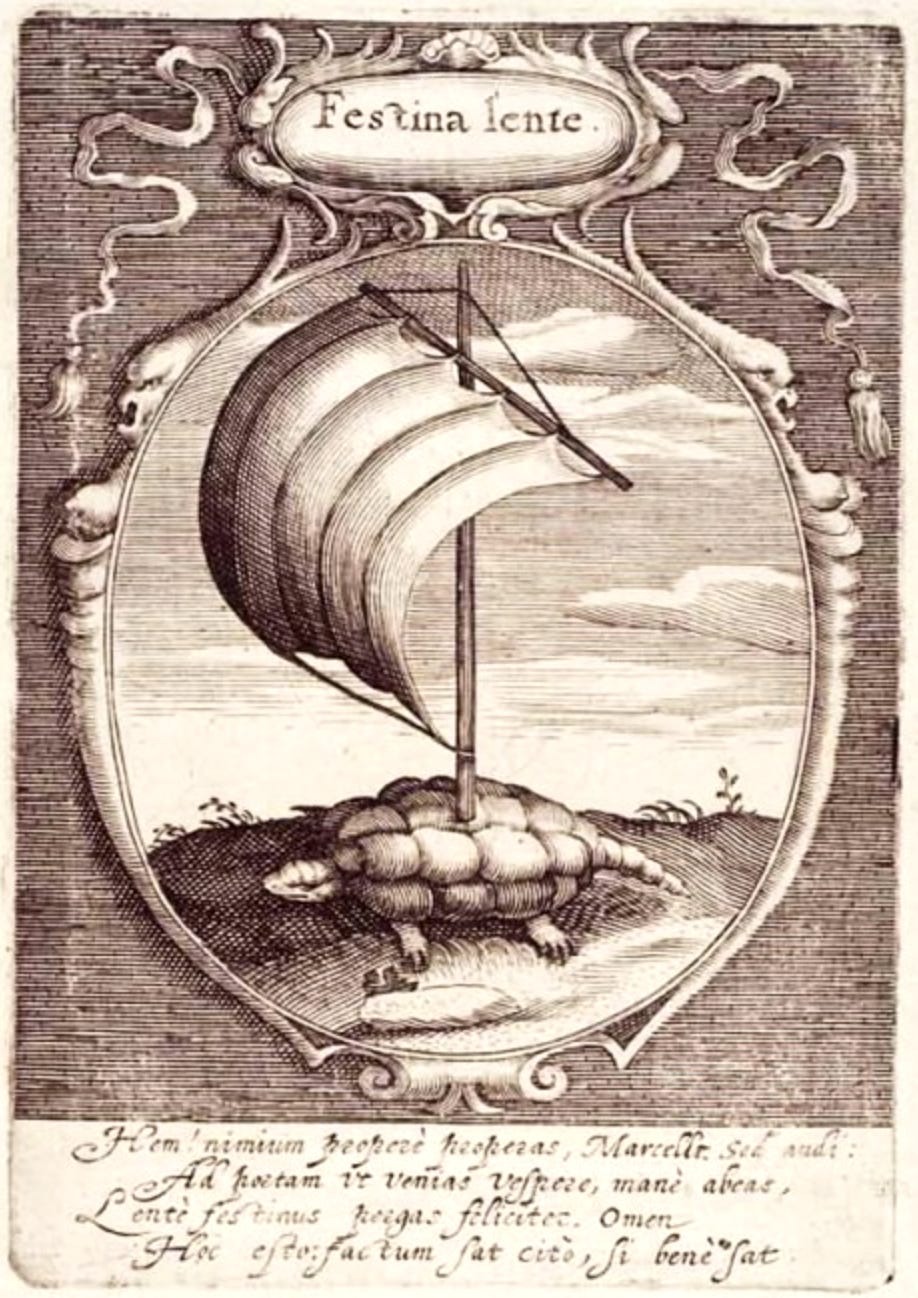 Cosimo l de’ Medici (1519–1574), Grand Duke of Tuscany, illustrated the phrase with a sail-backed tortoise. Here are three examples of Renaissance references to the adage. Probably every artist had their own way of painting this concept.