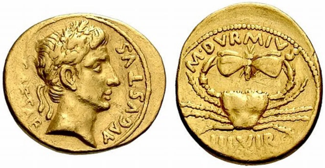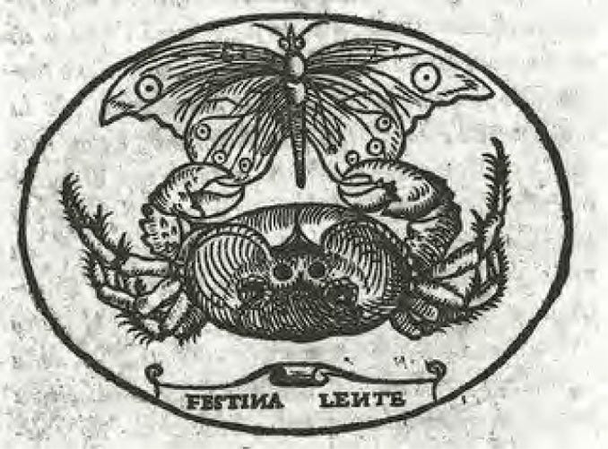 Suetonius, the Roman historian, records in De vita Caesarum that one of Augustus Caesar’s favorite sayings was Festina Lente. Augustus (63 BCE - 14 CE) thought that haste and rashness was “unbecoming of a well-trained leader,” and to help encourage this adage, Augustus minted gold coins with images of both a crab and a butterfly, inherent opposites.
