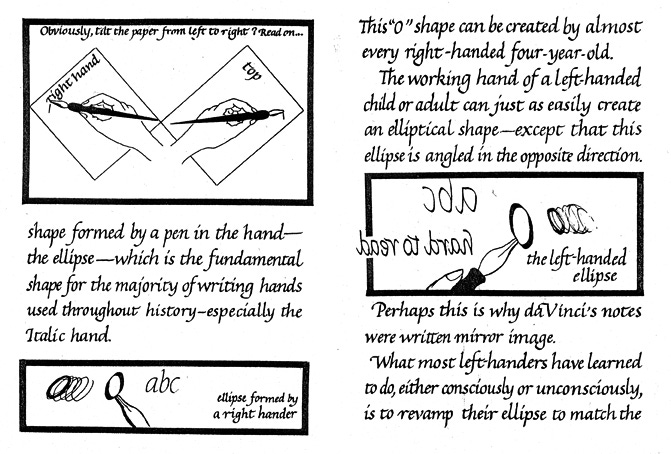 Paper Angle. There is an excellent 38-page booklet by Betsy Rivers-Kennedy, Insights into Left-Handed Calligraphy for students and teachers. It is out of print but I do have a copy. This excerpted page describes the basic problem of left-handed scribes trying to write a script designed for the right-handed majority. Left-handed calligraphers must solve the formation of the letter “O” before moving on to the rest of the alphabet, and most broad-edged pens are not designed to make this an easy task.