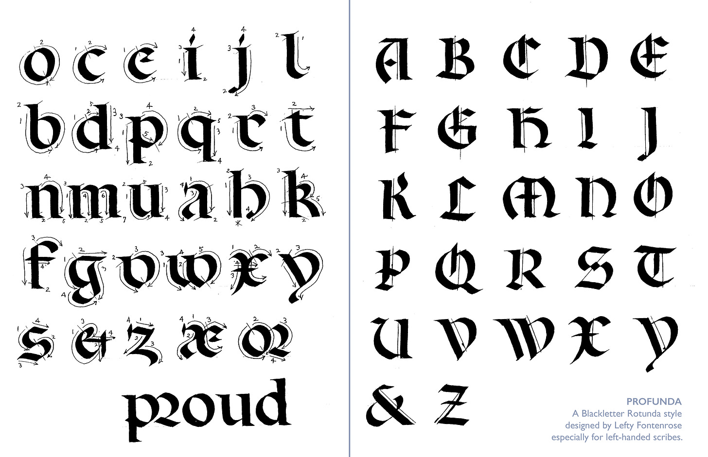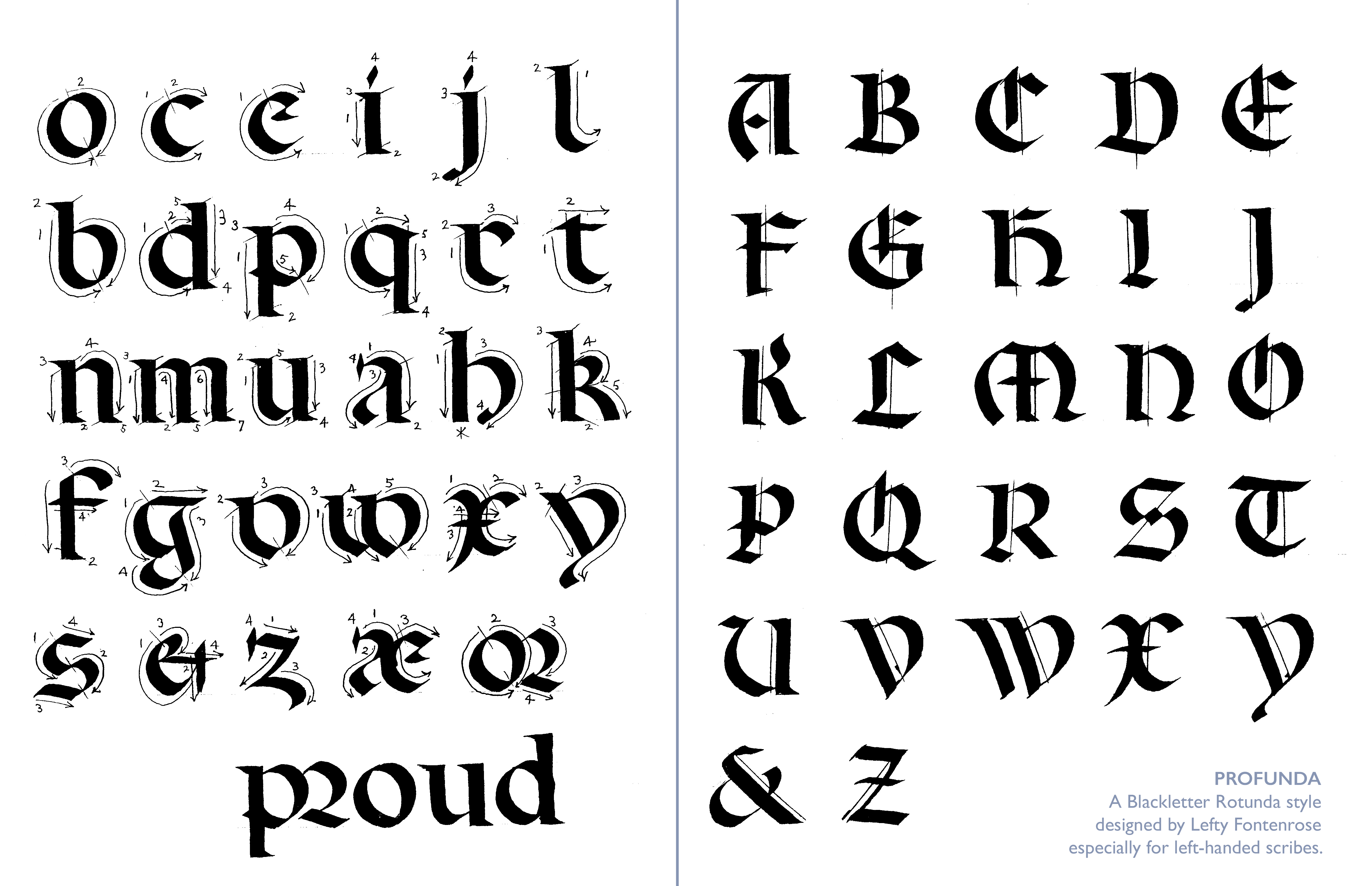 I have to mention Lefty Fontenrose, a friend, beloved member of the calligraphy community, and an accomplished left-handed calligrapher who loved teaching. He shared his writing spirit and massive sense of humor with members of The Friends of Calligraphy during one of their Trivial Pursuits events some 20 years ago that I was fortunate to attend. Lefty developed and taught his own version of Blackletter Rotunda, which he called “Profunda”. He shared his model in a handout and instructed us in making the specially formed serifs on the letter stems. Certain details are very appealing, like that “a” in line 3, and the clever formation of the minuscule “e”!