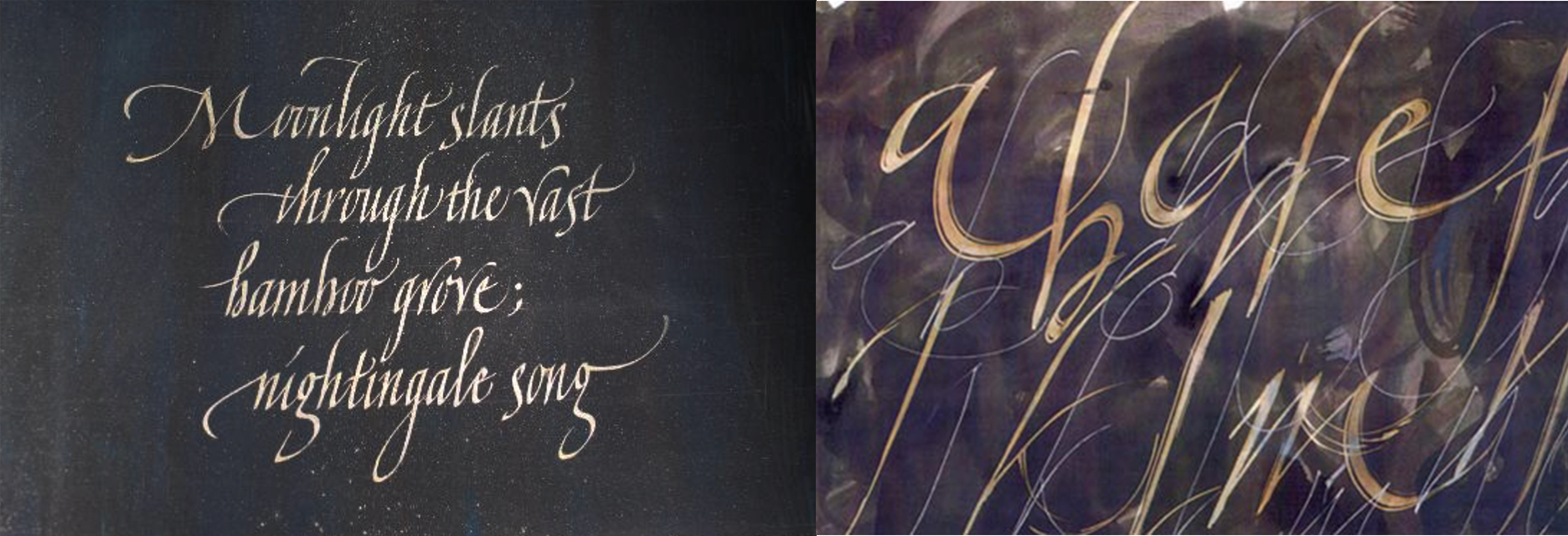 Among left-handed calligraphers, Gaynor Goffe also stands out for her command of letterform and creative text art with broad-edged and pointed pens. She has a distinctive flowing Italic hand and has inspired many to thrive in the lettering field.
