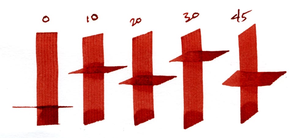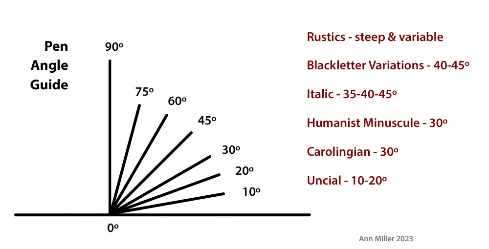 Pen Angle. Not everyone who signs up for a beginning calligraphy workshop is equally proficient at geometry, so achieving the pen angle required for a specific broad-edged pen script is not always easy or obvious. Some dexterity is also involved.