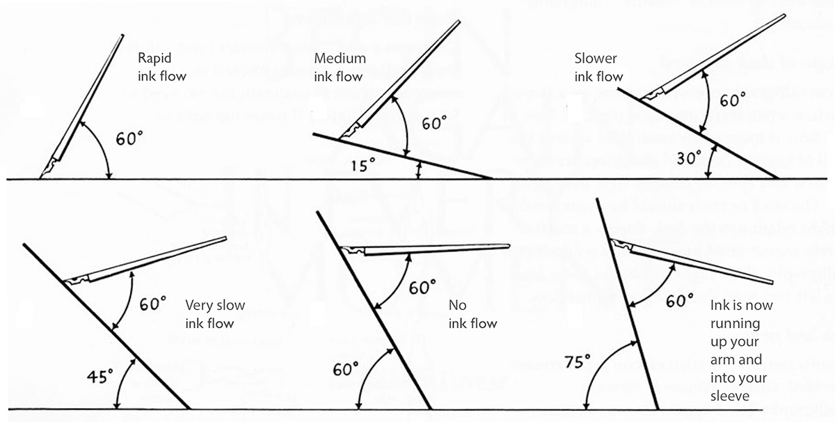 Board Angle. There is also the penhold (the angle of the body of the pen in relation to the board) that governs the speed of ink flow. While the angle of the pen to the board remains at 60º, different board slants facilitate control over the flow of ink. A steeper angle will help the flow of more concentrated sumi or more viscous inks and gouache mixtures. A shallower angle will slow the flow of watercolors or the thinner, diluted inks.