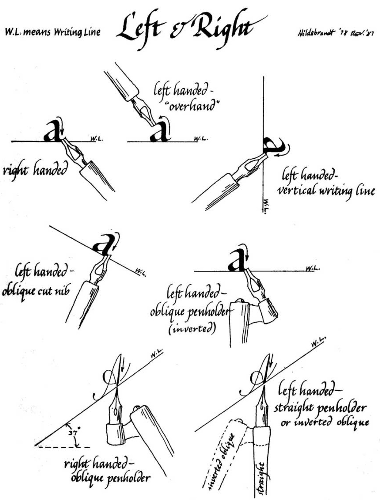 How to hold the pen in relation to the writing line is outlined by Bill Hildebrandt. Many how-to books on calligraphy were handwritten before the Age of Computers.