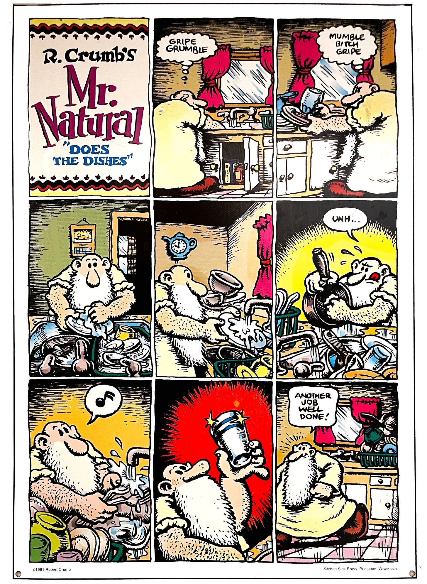 This cartoon by R. Crumb is printed on metal and hangs on the wall above our kitchen sink. It sums up the process of having to do a task, going from gripes to pride.