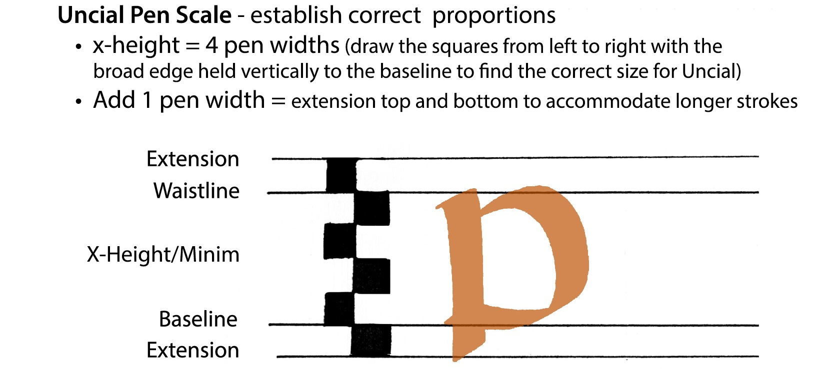 For our own study of any script, we begin with a pen scale. My teaching aid below for the introductory class shows the simple structure for letters written in Uncial, a bilinear script with some short extensions for letters such as p and d. The pen scale is used to mark off the lines for ruling down the page, within the set margins and inside the allotted image area. The pen scale is flexible, depending on the size of the nib you will be using.
