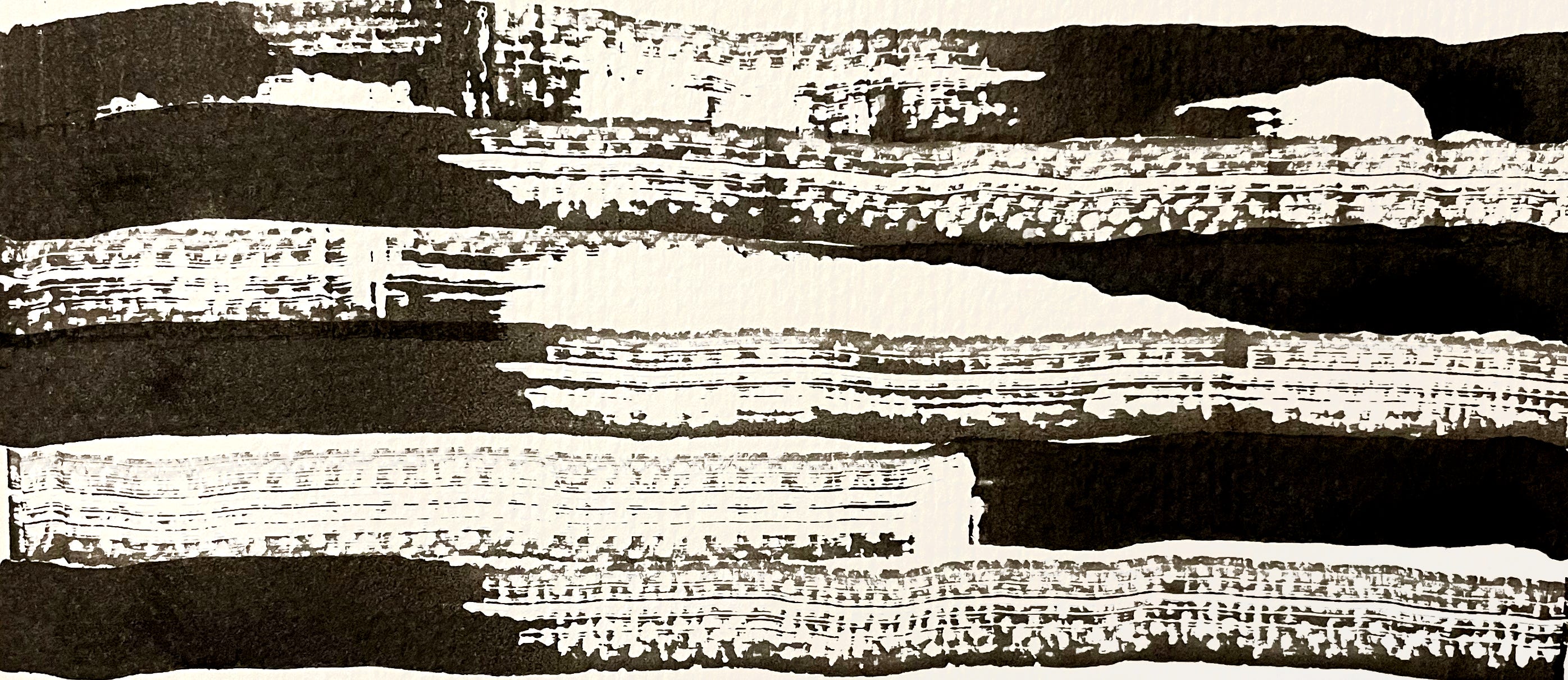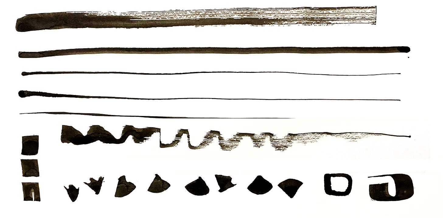 The humble chopstick piques the imagination and leads us into the more expansive realms of writing, with its ability to travel easily across the page, its larger size (square end = half inch wide, twice the size of a 6mm broad-edge metal nib), and its double-ended versatility providing both shape and line. For the beginner, the imprecise nature of the tool feels good, not at all intimidating. Unlike metal nibs, it doesn’t “catch” on the paper fibers. Its unevenness of stroke looks natural and is a sought-after quality. In the following image the dipped square end of the chopstick is drawn across a sheet of rough watercolor paper. Strokes are made in opposing directions, observing the balance of the whole. Handmade texture is useful for the designer and illustrator, to create vector files that can be manipulated digitally or otherwise. First make some test strokes and scan or photo them.