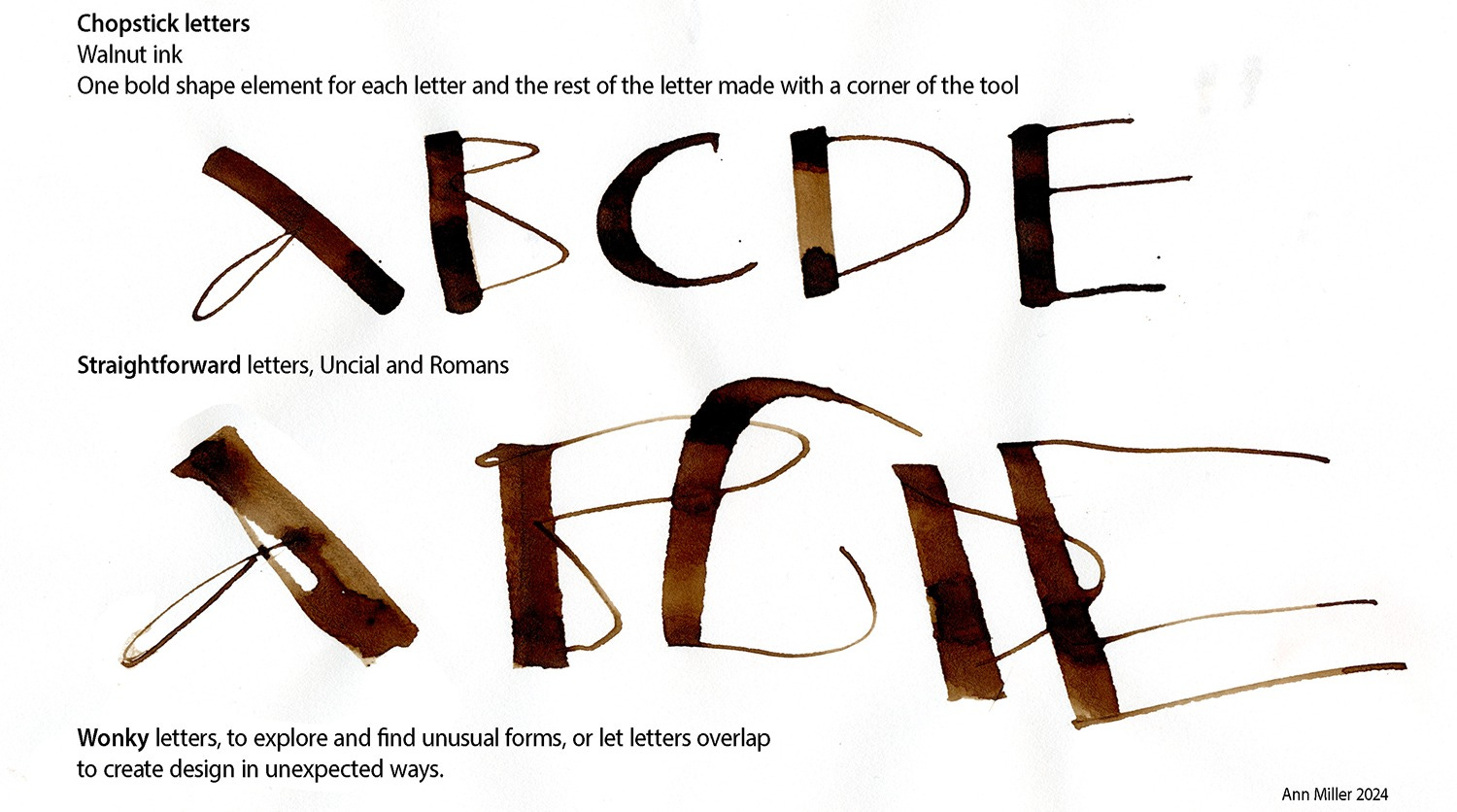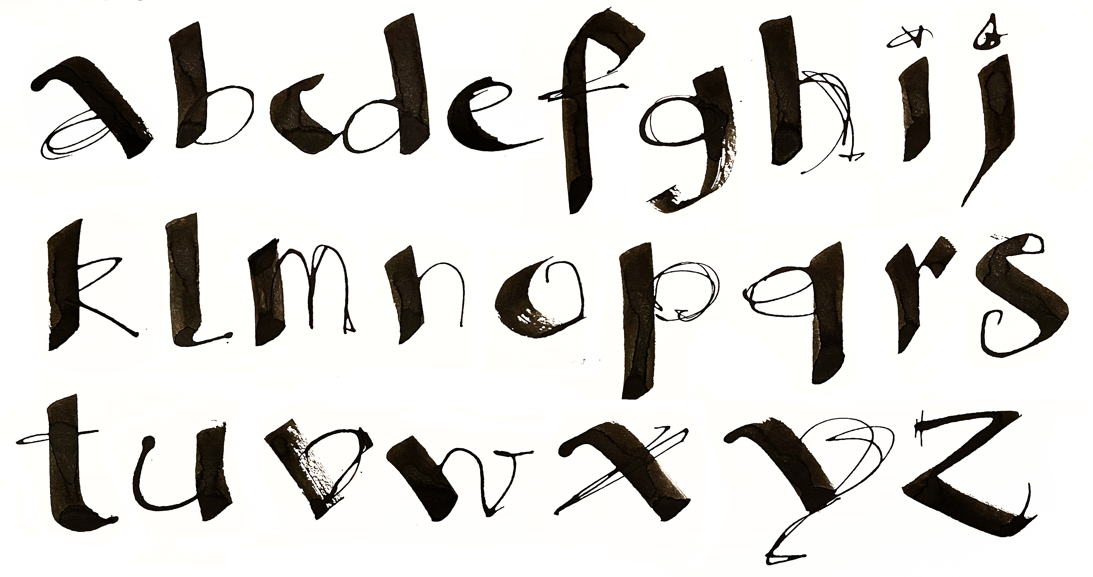 You can make an alphabet and test your sense of invention. Make one heavy stroke with the flat end and tip onto the corner to continue drawing with a secondary thin, lightweight line.