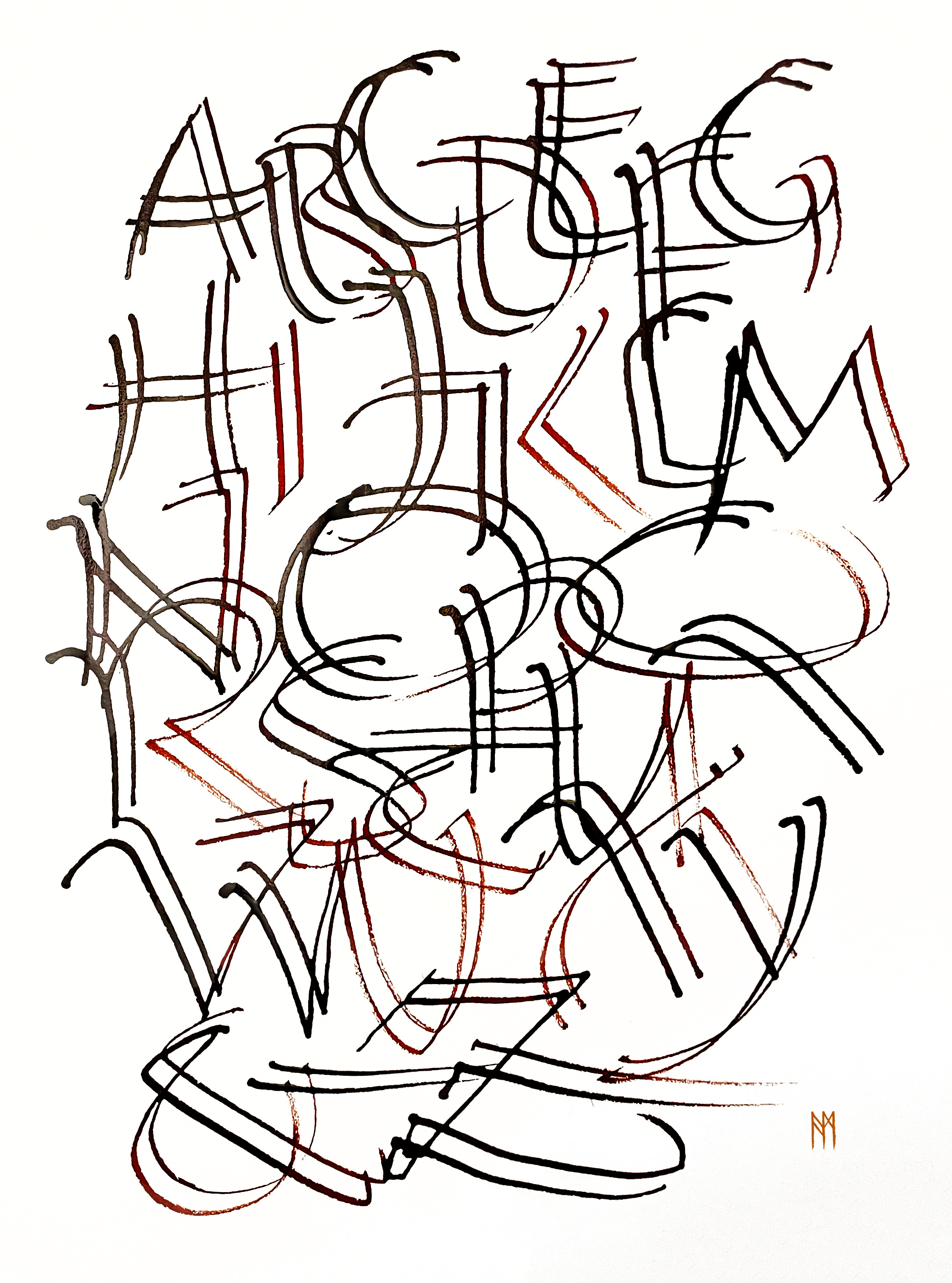 We build up to the point where we can write the entire alphabet on the page. Alternating positions up and down creates more opportunity for overlap. We focus on the flow of ink and the ideal speed required to keep the strokes unbroken and intact. The following demo in bister red ink shows interesting changes in color intensity as the ink becomes thin and wispy, a duotone effect.
