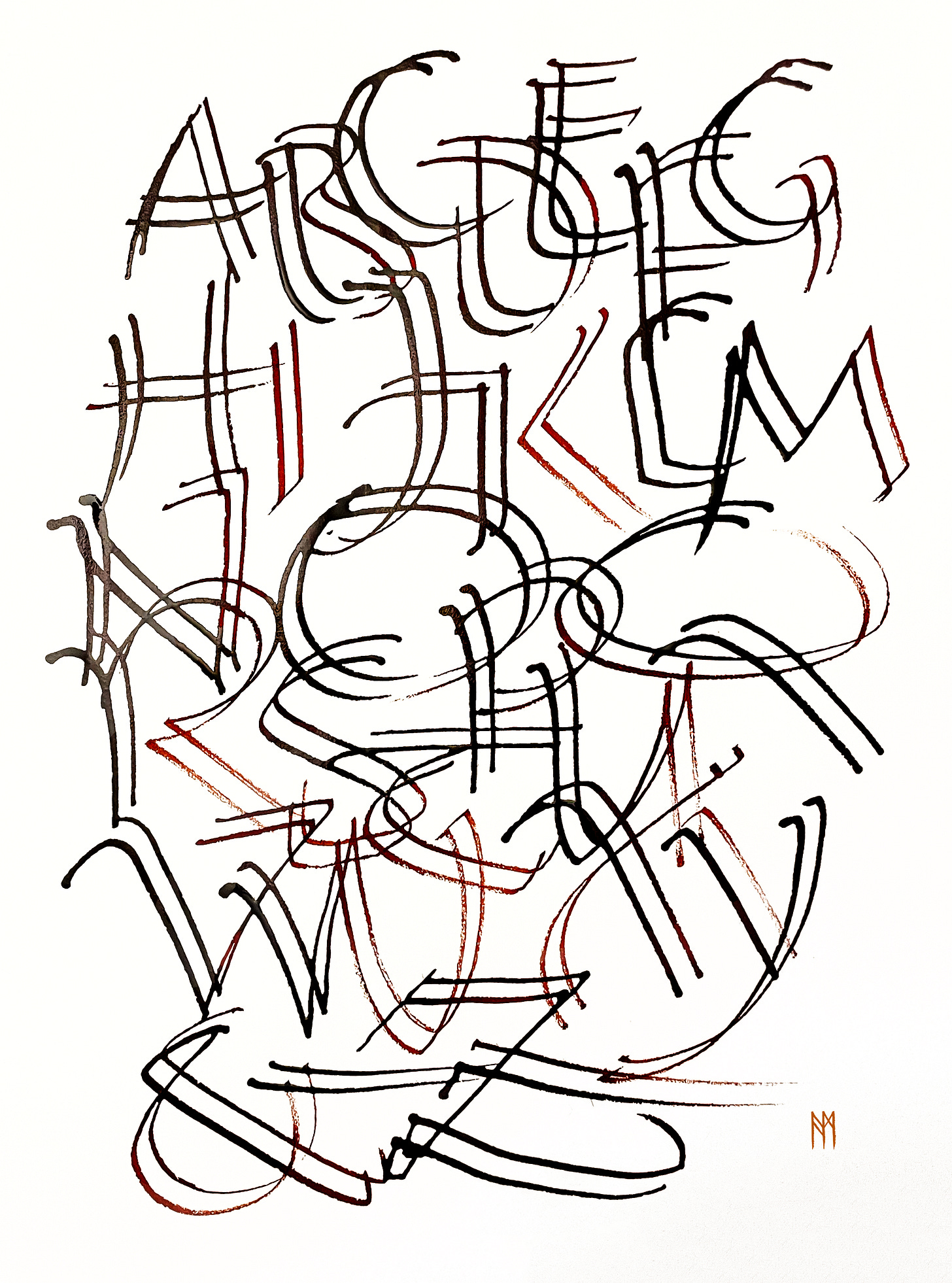 Next we take a look at the double-pointed end. This is a typical demo image for students Keeping both points on the page most of the time, especially for the main load-bearing stems, the letters emerge. Regular and invented letters will occur. Overlaps add challenge, increase sensitivity to placement and connection of forms, and greatly add to the interest of the page. Both ends can connect with the page, while a slight lift will allow only one tip to connect, reducing complexity and creating a “set” of single-stroke elements.