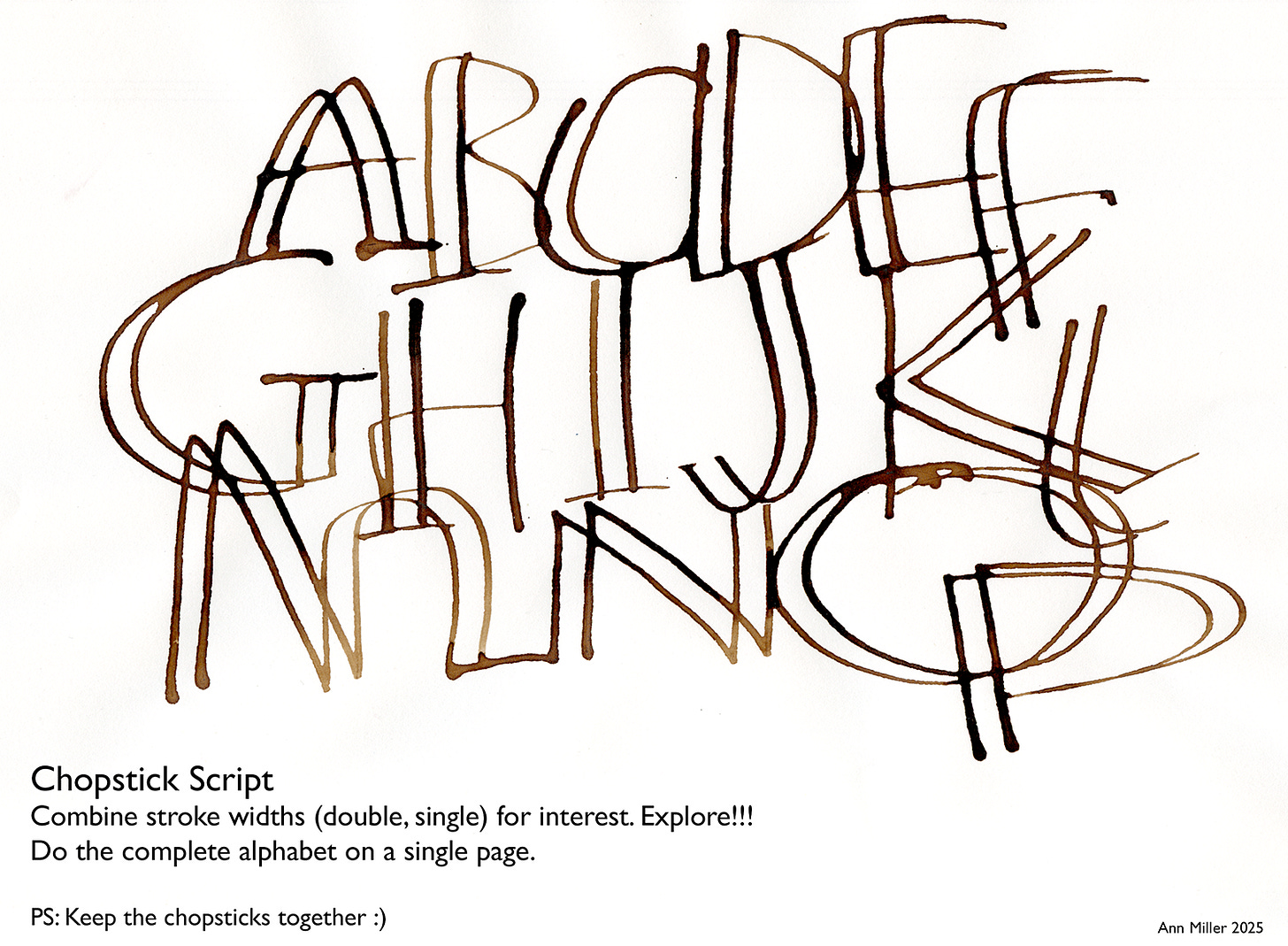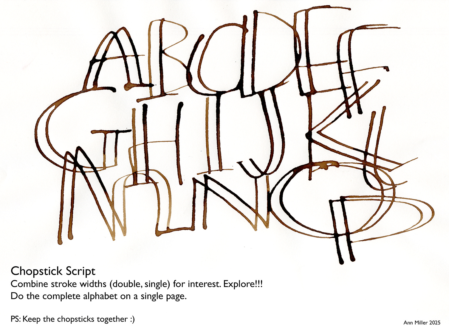 Making letters with chopsticks promotes quick, flexible thinking. It is an excellent tool for working on the design aspects of letter formation and text art. A sense of gestalt is present. The visual impact of the free-flowing stroke is a relief from the deep study of calligraphic hands, that long and ongoing arc of learning how to create precisely-styled minuscules at an exact size. The target is an improved grasp of design in organizing the spatial placement of your letters. The limitations of the tool are freeing.