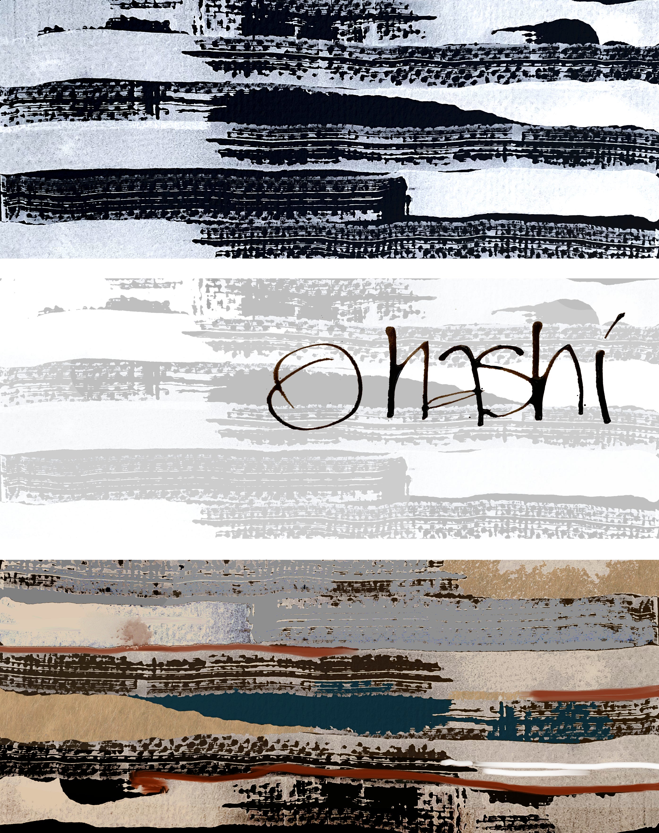 Use an image editor to make your changes. The three tests below show digital possibilities using an image editor. 1) simple image reversal; 2) image lightened, tinted, and overlaid with the honorific Japanese word for chopsticks (ohashi)written with the corner of the chopstick dipped in walnut ink; and 3) color play using digital filters, brush strokes, and selective color overlays, suggesting landscape. No need to purchase background textures! Make ‘em by hand.