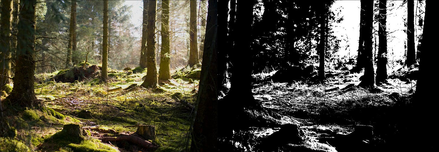 Learning to see black and white simultaneously is a process. We may understand innately when something is optically off balance, but knowing how to describe it in terms of design, or how to prevent it, is something that bears investigation, because it enables critical thinking and helps us communicate with other interested parties. Taking a posterized view of a photograph shows us the distribution of dark and light in any composition, making it easier to weed out inconsequential elements and promote our personal take.